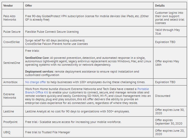 Many of you have contacted SynerComm to get additional VPN licenses/concentrators, endpoint security controls, and help designing and spinning up “new ways” to get employees connected securely. During these crazy times some of our vendors are stepping up and trying to make a difference.